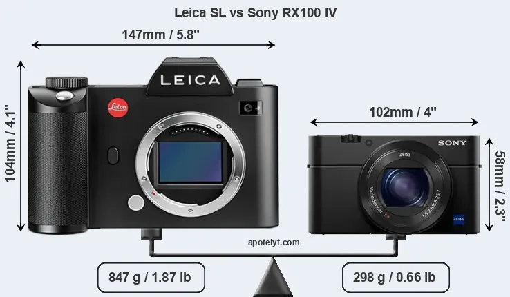 The physical size and weight of the Leica SL and the Sony RX100 IV are illustrated in the side-by-side display below. The two cameras are presented according to their relative size. Three consecutive perspectives from the front, the top, and the back are available. All width, height and depth measures are rounded to the nearest millimeter.