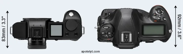 An illustration of the physical size and weight of the Leica SL2-S and the Nikon D6 is provided in the side-by-side display below. The two cameras are presented according to their relative size. Three successive views from the front, the top, and the rear are shown. All size dimensions are rounded to the nearest millimeter.