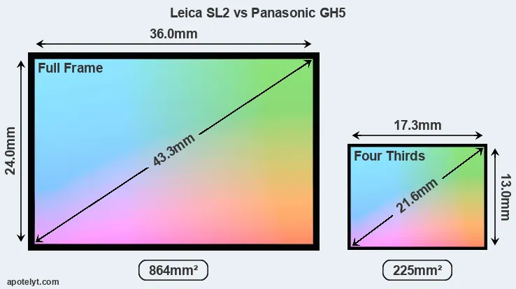 Of the two cameras under consideration, the Leica SL2 features a full frame sensor and the Panasonic GH5 a Four Thirds sensor. The sensor area in the GH5 is 74 percent smaller. As a result of these sensor size differences, the cameras have a format factor of, respectively, 1.0 and 2.0. The sensor in the Leica SL2 has a native 3:2 aspect ratio, while the one in the GH5 offers a 4:3 aspect.