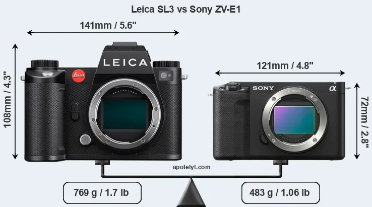 If the front view area (width x height) of the cameras is taken as an aggregate measure of their size, the Sony ZV-E1 is considerably smaller (43 percent) than the Leica SL3. Moreover, the ZV-E1 is substantially lighter (43 percent) than the Leica SL3. In this context, it is worth noting that both cameras are splash and dust-proof and can, hence, be used in inclement weather conditions or harsh environments.
