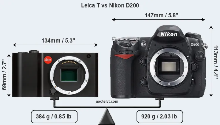 If the front view area (width x height) of the cameras is taken as an aggregate measure of their size, the Nikon D200 is considerably larger (80 percent) than the Leica T. Moreover, the D200 is substantially heavier (140 percent) than the T Typ 701. It is noteworthy in this context that the D200 is splash and dust-proof, while the T Typ 701 does not feature any corresponding weather-sealing.
