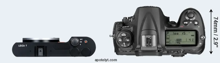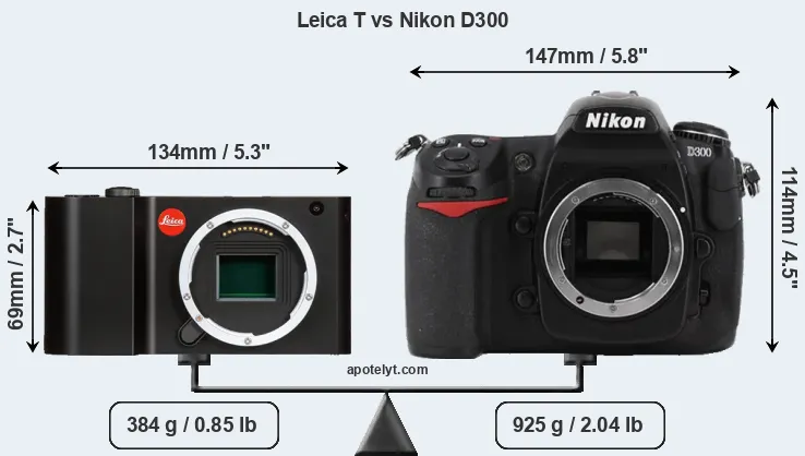 If the front view area (width x height) of the cameras is taken as an aggregate measure of their size, the Nikon D300 is considerably larger (81 percent) than the Leica T. Moreover, the D300 is substantially heavier (141 percent) than the T Typ 701. It is noteworthy in this context that the D300 is splash and dust-proof, while the T Typ 701 does not feature any corresponding weather-sealing.