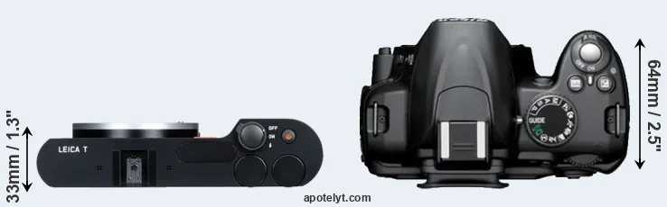 The side-by-side display below illustrates the physical size and weight of the Leica T and the Nikon D3000. The two cameras are presented according to their relative size. Three consecutive perspectives from the front, the top, and the back are available. All width, height and depth measures are rounded to the nearest millimeter.