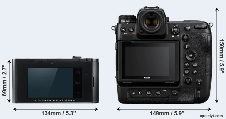 The side-by-side display below illustrates the physical size and weight of the Leica T and the Nikon Z9. The two cameras are presented according to their relative size. Three consecutive perspectives from the front, the top, and the back are available. All width, height and depth dimensions are rounded to the nearest millimeter.