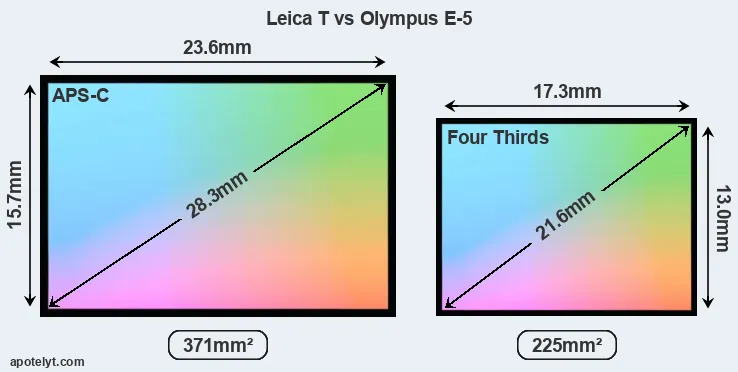 Of the two cameras under consideration, the Leica T features an APS-C sensor and the Olympus E-5 a Four Thirds sensor. The sensor area in the E-5 is 39 percent smaller. As a result of these sensor size differences, the cameras have a format factor of, respectively, 1.5 and 2.0. The sensor in the T Typ 701 has a native 3:2 aspect ratio, while the one in the E-5 offers a 4:3 aspect.