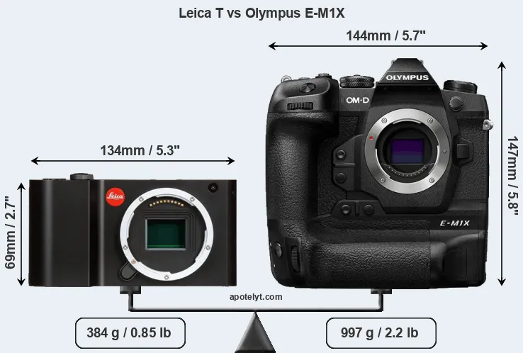 If the front view area (width x height) of the cameras is taken as an aggregate measure of their size, the Olympus E-M1X is considerably larger (129 percent) than the Leica T. Moreover, the E-M1X is substantially heavier (160 percent) than the T Typ 701. It is noteworthy in this context that the E-M1X is splash and dust-proof, while the T Typ 701 does not feature any corresponding weather-sealing.