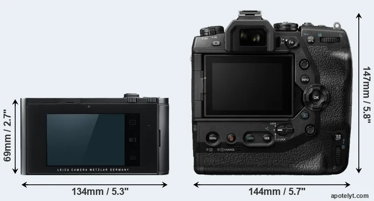 The side-by-side display below illustrates the physical size and weight of the Leica T and the Olympus E-M1X. The two cameras are presented according to their relative size. Three consecutive views from the front, the top, and the rear side are shown. All width, height and depth measures are rounded to the nearest millimeter.