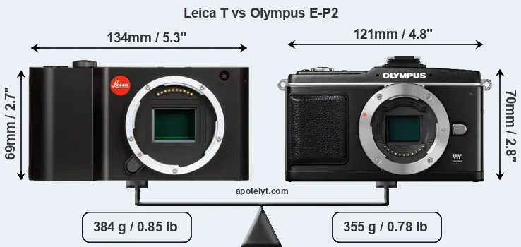 The physical size and weight of the Leica T and the Olympus E-P2 are illustrated in the side-by-side display below. The two cameras are presented according to their relative size. Three consecutive views from the front, the top, and the rear side are shown. All width, height and depth measures are rounded to the nearest millimeter.