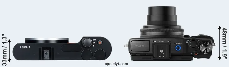 The physical size and weight of the Leica T and the Olympus XZ-2 are illustrated in the side-by-side display below. The two cameras are presented according to their relative size. Three consecutive perspectives from the front, the top, and the back are available. All width, height and depth dimensions are rounded to the nearest millimeter.