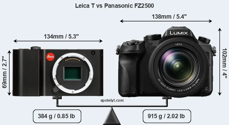 An illustration of the physical size and weight of the Leica T and the Panasonic FZ2500 is provided in the side-by-side display below. The two cameras are presented according to their relative size. Three consecutive views from the front, the top, and the rear side are shown. All width, height and depth measures are rounded to the nearest millimeter.