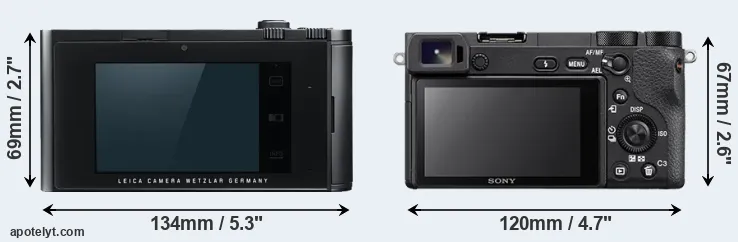 If the front view area (width x height) of the cameras is taken as an aggregate measure of their size, the Sony A6500 is notably smaller (13 percent) than the Leica T. However, the A6500 is markedly heavier (18 percent) than the T Typ 701. It is noteworthy in this context that the A6500 is splash and dust-proof, while the T Typ 701 does not feature any corresponding weather-sealing.