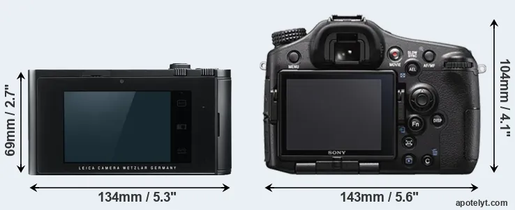 The physical size and weight of the Leica T and the Sony A77 II are illustrated in the side-by-side display below. The two cameras are presented according to their relative size. Three consecutive views from the front, the top, and the rear side are shown. All width, height and depth measures are rounded to the nearest millimeter.