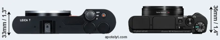 An illustration of the physical size and weight of the Leica T and the Sony HX95 is provided in the side-by-side display below. The two cameras are presented according to their relative size. Three successive views from the front, the top, and the rear are shown. All width, height and depth dimensions are rounded to the nearest millimeter.