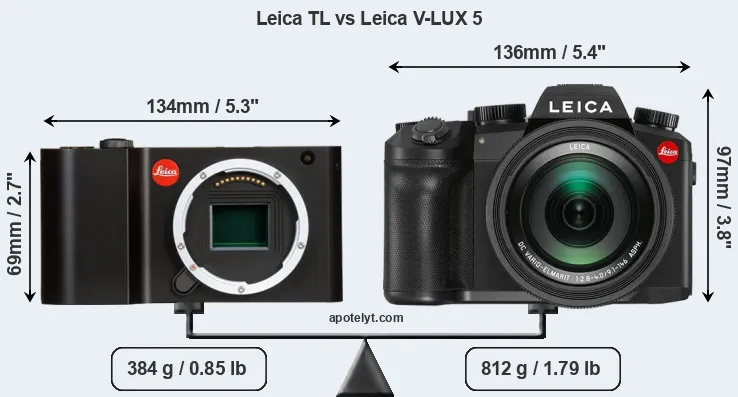 The physical size and weight of the Leica TL and the Leica V-LUX 5 are illustrated in the side-by-side display below. The two cameras are presented according to their relative size. Three consecutive perspectives from the front, the top, and the back are available. All width, height and depth dimensions are rounded to the nearest millimeter.