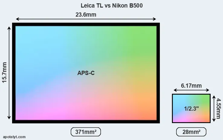 Of the two cameras under consideration, the Leica TL features an APS-C sensor and the Nikon B500 a 1/2.3-inch sensor. The sensor area in the B500 is 92 percent smaller. As a result of these sensor size differences, the cameras have a format factor of, respectively, 1.5 and 5.6. The sensor in the TL has a native 3:2 aspect ratio, while the one in the B500 offers a 4:3 aspect.