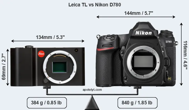 If the front view area (width x height) of the cameras is taken as an aggregate measure of their size, the Nikon D780 is considerably larger (81 percent) than the Leica TL. Moreover, the D780 is substantially heavier (119 percent) than the TL. It is noteworthy in this context that the D780 is splash and dust-proof, while the TL does not feature any corresponding weather-sealing.