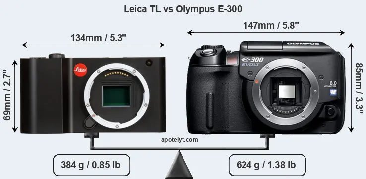 If the front view area (width x height) of the cameras is taken as an aggregate measure of their size, the Olympus E-300 is notably larger (35 percent) than the Leica TL. Moreover, the E-300 is substantially heavier (63 percent) than the TL. In this context, it is worth noting that neither the TL nor the E-300 are weather-sealed.