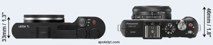 The side-by-side display below illustrates the physical size and weight of the Leica TL and the Panasonic LX7. The two cameras are presented according to their relative size. Three consecutive views from the front, the top, and the rear side are shown. All width, height and depth dimensions are rounded to the nearest millimeter.