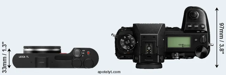 The physical size and weight of the Leica TL and the Panasonic S1R are illustrated in the side-by-side display below. The two cameras are presented according to their relative size. Three consecutive perspectives from the front, the top, and the back are available. All width, height and depth measures are rounded to the nearest millimeter.