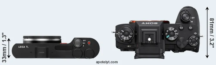 An illustration of the physical size and weight of the Leica TL and the Sony A1 is provided in the side-by-side display below. The two cameras are presented according to their relative size. Three consecutive perspectives from the front, the top, and the back are available. All size dimensions are rounded to the nearest millimeter.