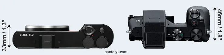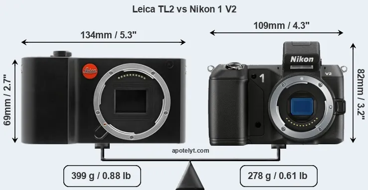 An illustration of the physical size and weight of the Leica TL2 and the Nikon 1 V2 is provided in the side-by-side display below. The two cameras are presented according to their relative size. Three consecutive views from the front, the top, and the rear side are shown. All width, height and depth measures are rounded to the nearest millimeter.