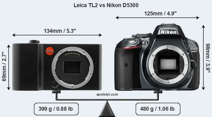 The physical size and weight of the Leica TL2 and the Nikon D5300 are illustrated in the side-by-side display below. The two cameras are presented according to their relative size. Three consecutive views from the front, the top, and the rear side are shown. All width, height and depth measures are rounded to the nearest millimeter.