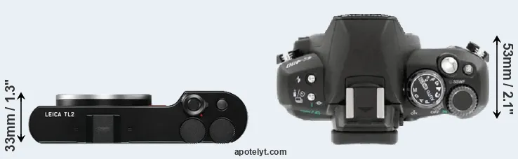 The physical size and weight of the Leica TL2 and the Olympus E-400 are illustrated in the side-by-side display below. The two cameras are presented according to their relative size. Three consecutive perspectives from the front, the top, and the back are available. All width, height and depth dimensions are rounded to the nearest millimeter.