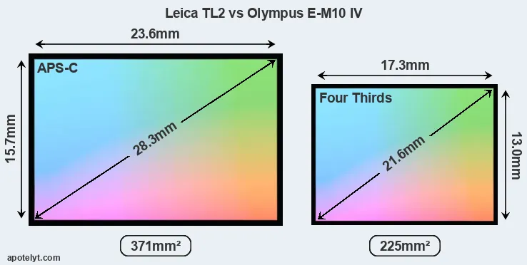 Of the two cameras under consideration, the Leica TL2 features an APS-C sensor and the Olympus E-M10 IV a Four Thirds sensor. The sensor area in the E-M10 IV is 39 percent smaller. As a result of these sensor size differences, the cameras have a format factor of, respectively, 1.5 and 2.0. The sensor in the TL2 has a native 3:2 aspect ratio, while the one in the E-M10 IV offers a 4:3 aspect.