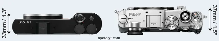 The physical size and weight of the Leica TL2 and the Olympus PEN-F are illustrated in the side-by-side display below. The two cameras are presented according to their relative size. Three successive views from the front, the top, and the rear are shown. All width, height and depth measures are rounded to the nearest millimeter.