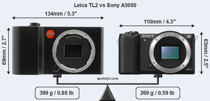 If the front view area (width x height) of the cameras is taken as an aggregate measure of their size, the Sony A5000 is notably smaller (25 percent) than the Leica TL2. Moreover, the A5000 is markedly lighter (33 percent) than the TL2. In this context, it is worth noting that neither the TL2 nor the A5000 are weather-sealed.
