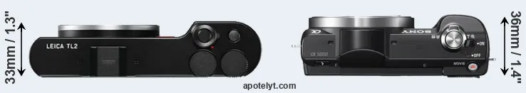 An illustration of the physical size and weight of the Leica TL2 and the Sony A5000 is provided in the side-by-side display below. The two cameras are presented according to their relative size. Three consecutive views from the front, the top, and the rear side are shown. All size dimensions are rounded to the nearest millimeter.