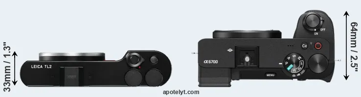 The physical size and weight of the Leica TL2 and the Sony A6700 are illustrated in the side-by-side display below. The two cameras are presented according to their relative size. Three successive views from the front, the top, and the rear are shown. All width, height and depth measures are rounded to the nearest millimeter.