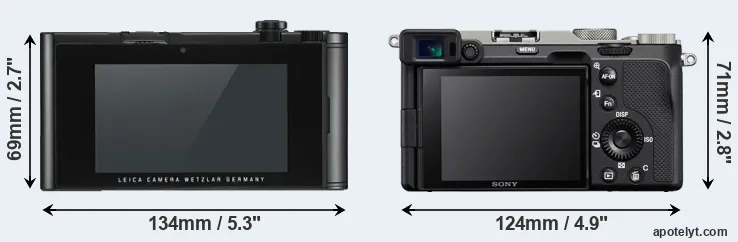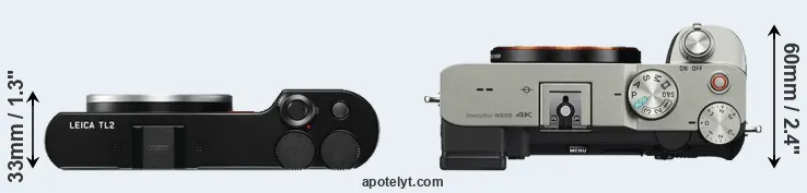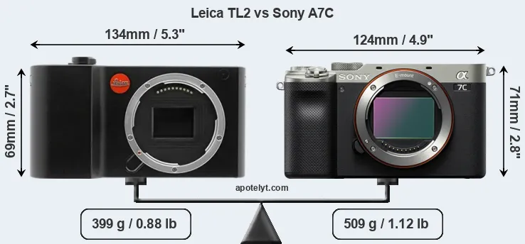 The side-by-side display below illustrates the physical size and weight of the Leica TL2 and the Sony A7C. The two cameras are presented according to their relative size. Three successive views from the front, the top, and the rear are shown. All width, height and depth dimensions are rounded to the nearest millimeter.