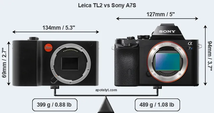 The physical size and weight of the Leica TL2 and the Sony A7S are illustrated in the side-by-side display below. The two cameras are presented according to their relative size. Three consecutive perspectives from the front, the top, and the back are available. All width, height and depth measures are rounded to the nearest millimeter.