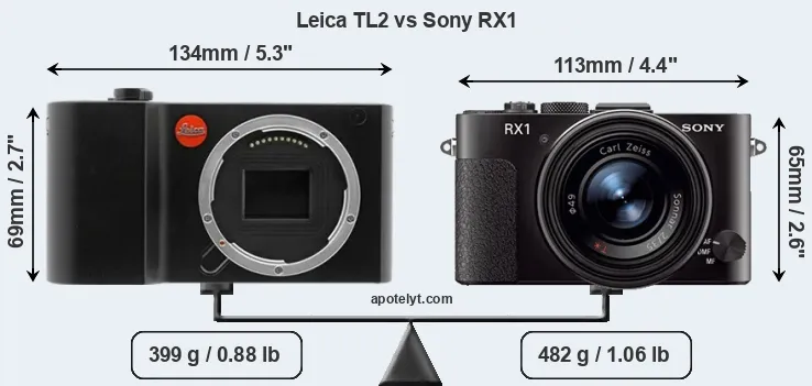 The physical size and weight of the Leica TL2 and the Sony RX1 are illustrated in the side-by-side display below. The two cameras are presented according to their relative size. Three successive views from the front, the top, and the rear are shown. All width, height and depth measures are rounded to the nearest millimeter.