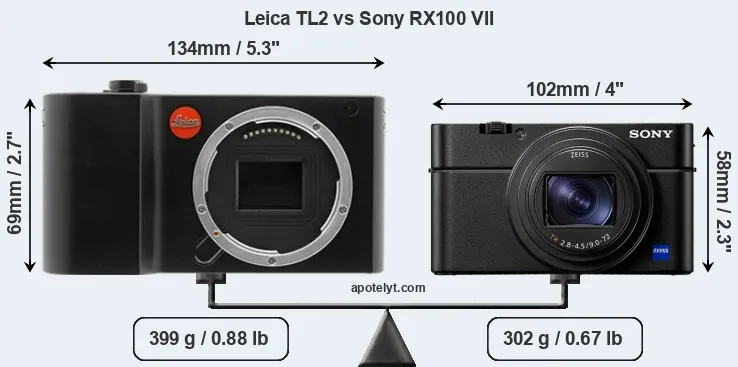 The side-by-side display below illustrates the physical size and weight of the Leica TL2 and the Sony RX100 VII. The two cameras are presented according to their relative size. Three successive views from the front, the top, and the rear are shown. All width, height and depth measures are rounded to the nearest millimeter.