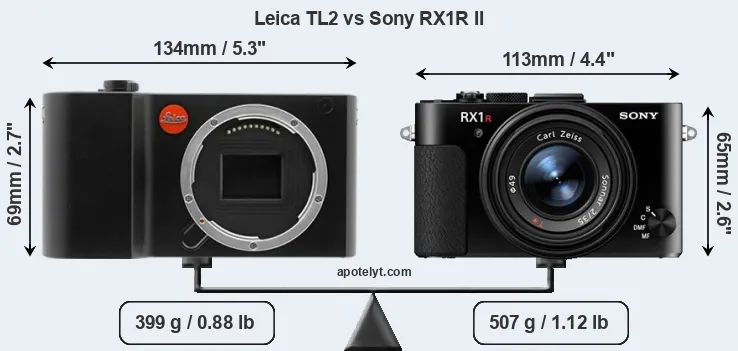 An illustration of the physical size and weight of the Leica TL2 and the Sony RX1R II is provided in the side-by-side display below. The two cameras are presented according to their relative size. Three consecutive perspectives from the front, the top, and the back are available. All width, height and depth measures are rounded to the nearest millimeter.