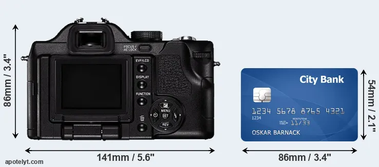 An illustration of the physical dimensions of the Leica V-LUX 1 vis-à-vis a credit card is provided in the side-by-side display below. Three successive views from the front, the top, and the rear are shown. All width, height and depth dimensions are rounded to the nearest millimeter.