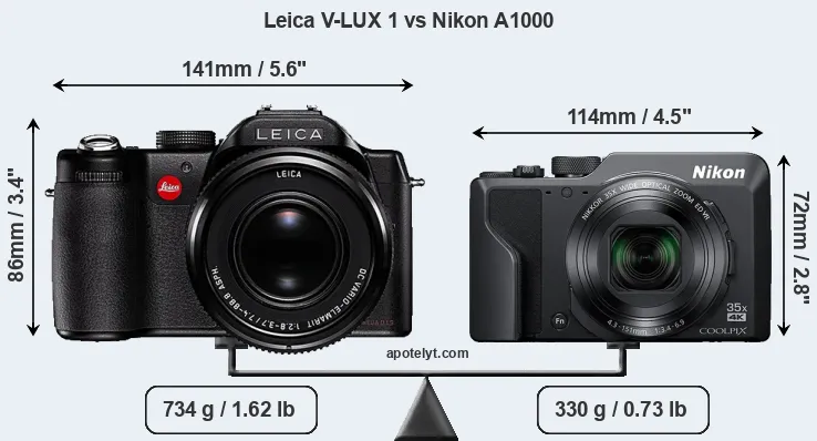 If the front view area (width x height) of the cameras is taken as an aggregate measure of their size, the Nikon A1000 is considerably smaller (32 percent) than the Leica V-LUX 1. Moreover, the A1000 is substantially lighter (55 percent) than the V-LUX 1. In this context, it is worth noting that neither the V-LUX 1 nor the A1000 are weather-sealed.