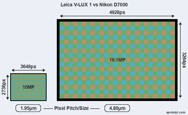 | Sensor Specs | Leica V-LUX 1 | Nikon D7000 |