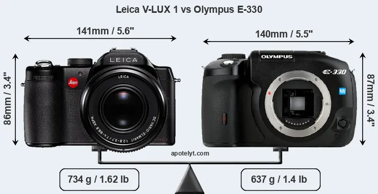 If the front view area (width x height) of the cameras is taken as an aggregate measure of their size, the Leica V-LUX 1 and the Olympus E-330 are of equal size. In this context, it is worth noting that neither the V-LUX 1 nor the E-330 are weather-sealed.