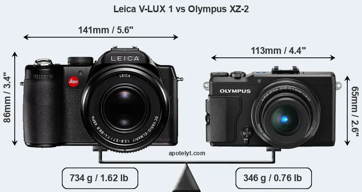 If the front view area (width x height) of the cameras is taken as an aggregate measure of their size, the Olympus XZ-2 is considerably smaller (39 percent) than the Leica V-LUX 1. Moreover, the XZ-2 is substantially lighter (53 percent) than the V-LUX 1. In this context, it is worth noting that neither the V-LUX 1 nor the XZ-2 are weather-sealed.