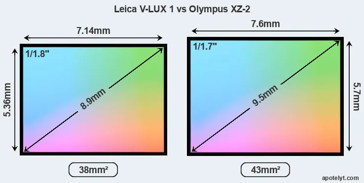 Of the two cameras under consideration, the Leica V-LUX 1 features a 1/1.8-inch sensor and the Olympus XZ-2 a 1/1.7-inch sensor. The sensor area in the XZ-2 is 13 percent bigger. As a result of these sensor size differences, the cameras have a format factor of, respectively, 4.8 and 4.4. Both cameras feature a native aspect ratio (sensor width to sensor height) of 4:3.