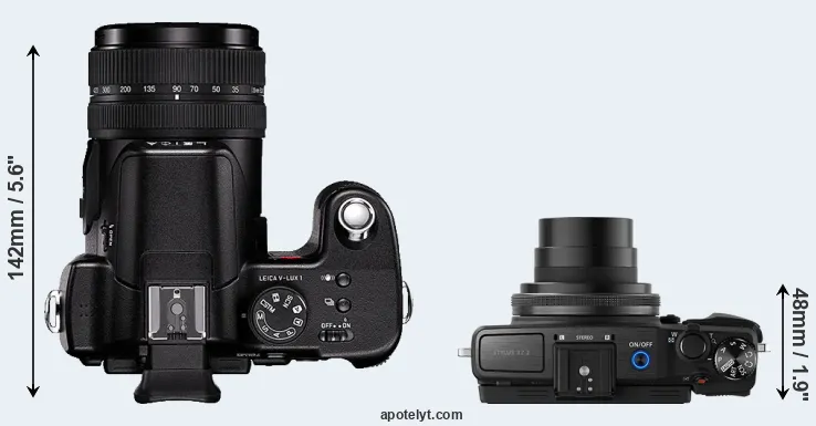 The side-by-side display below illustrates the physical size and weight of the Leica V-LUX 1 and the Olympus XZ-2. The two cameras are presented according to their relative size. Three successive views from the front, the top, and the rear are shown. All size dimensions are rounded to the nearest millimeter.