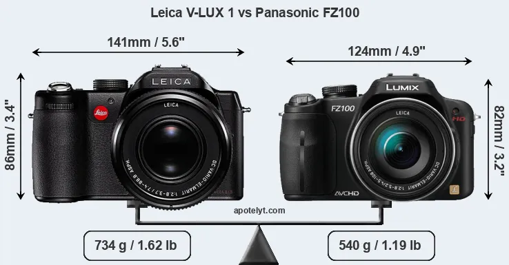 An illustration of the physical size and weight of the Leica V-LUX 1 and the Panasonic FZ100 is provided in the side-by-side display below. The two cameras are presented according to their relative size. Three successive views from the front, the top, and the rear are shown. All width, height and depth dimensions are rounded to the nearest millimeter.