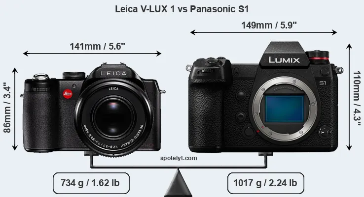If the front view area (width x height) of the cameras is taken as an aggregate measure of their size, the Panasonic S1 is notably larger (35 percent) than the Leica V-LUX 1. It is noteworthy in this context that the S1 is splash and dust-proof, while the V-LUX 1 does not feature any corresponding weather-sealing.