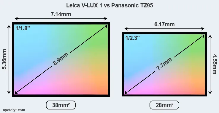 Of the two cameras under consideration, the Leica V-LUX 1 features a 1/1.8-inch sensor and the Panasonic TZ95 a 1/2.3-inch sensor. The sensor area in the TZ95 is 26 percent smaller. As a result of these sensor size differences, the cameras have a format factor of, respectively, 4.8 and 5.6. Both cameras feature a native aspect ratio (sensor width to sensor height) of 4:3.
