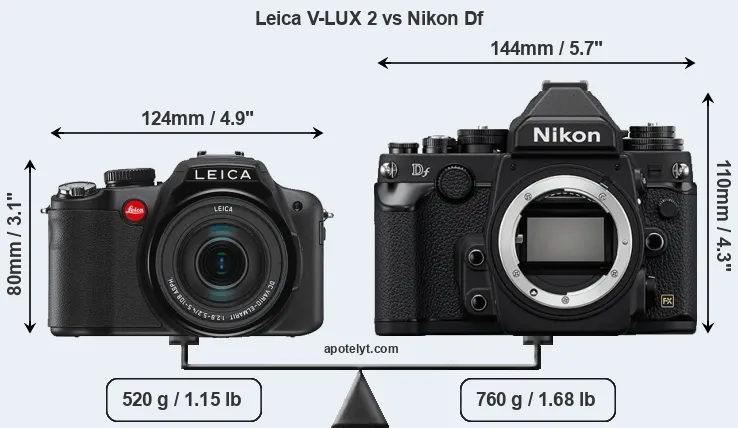 The above size and weight comparisons are to some extent incomplete and possibly misleading, as the V-LUX 2 has a lens built in, whereas the Df is an interchangeable lens camera that requires a separate lens. Attaching the latter will add extra weight and bulk to the setup. You can compare the optics available for the Df and their specifications in the Nikon Lens Catalog.
