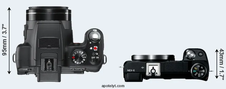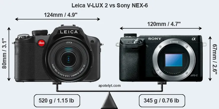 The side-by-side display below illustrates the physical size and weight of the Leica V-LUX 2 and the Sony NEX-6. The two cameras are presented according to their relative size. Three consecutive perspectives from the front, the top, and the back are available. All width, height and depth measures are rounded to the nearest millimeter.