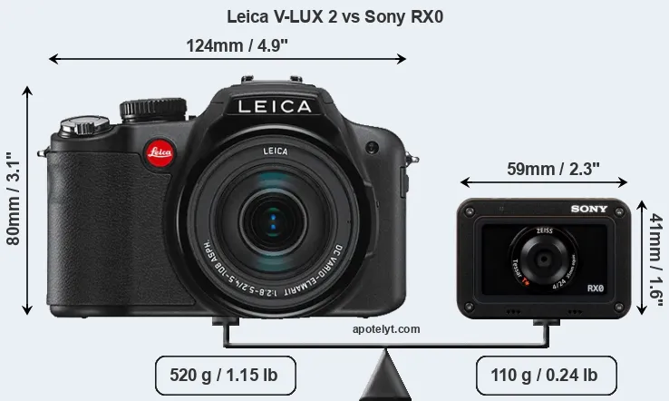 If the front view area (width x height) of the cameras is taken as an aggregate measure of their size, the Sony RX0 is considerably smaller (76 percent) than the Leica V-LUX 2. Moreover, the RX0 is substantially lighter (79 percent) than the V-LUX 2. It is noteworthy in this context that the RX0 is splash and dust-proof, while the V-LUX 2 does not feature any corresponding weather-sealing. More than that, the RX0 is water-proof up to 10m and can, thus, be used for underwater photography.